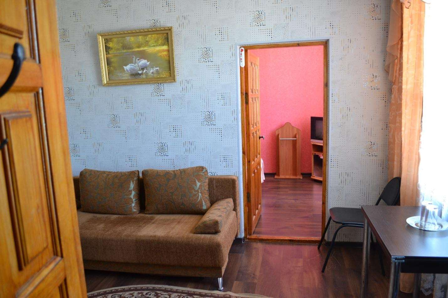 Просторный двухкомнатный номер с двуспальной кроватью, предусмотрена зона отдыха. Установлен кондиционер. В номере имеется цветной телевизор, холодильник, бесплатный доступ в интернет.